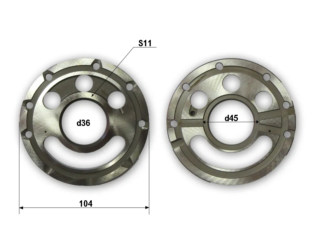 Диск из металла с центральным отверствием и каналами от поверхности контакта с блоком цилиндров до корпусных каналов нагнетания и всасывания рабочей жидкости .