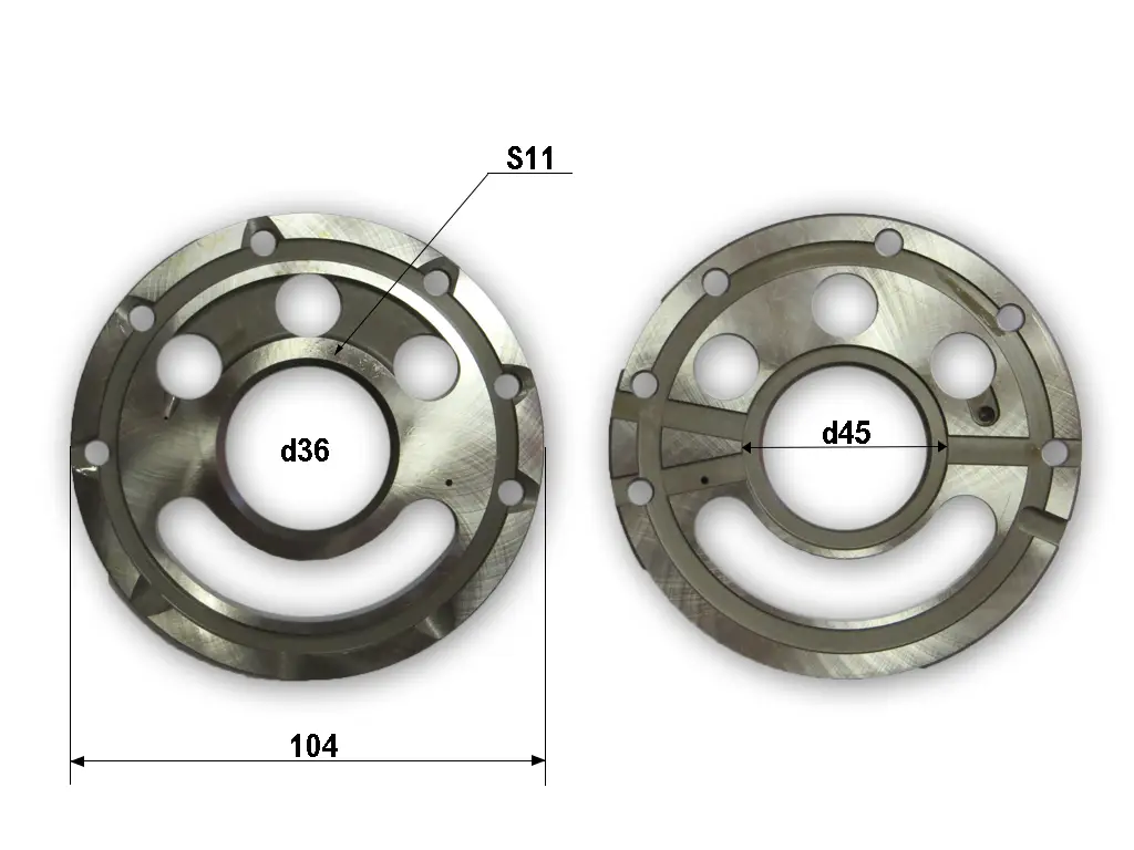 Диск из металла с центральным отверствием и каналами от поверхности контакта с блоком цилиндров до корпусных каналов нагнетания и всасывания рабочей жидкости .