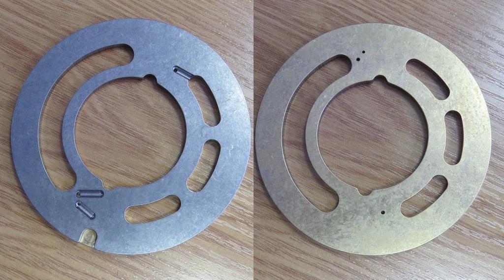 Диск из металла с центральным отверствием и каналами от поверхности контакта с блоком цилиндров до корпусных каналов нагнетания и всасывания рабочей жидкости .