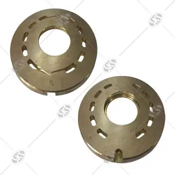 Диск из металла с центральным отверствием и каналами от поверхности контакта с блоком цилиндров до корпусных каналов нагнетания и всасывания рабочей жидкости .