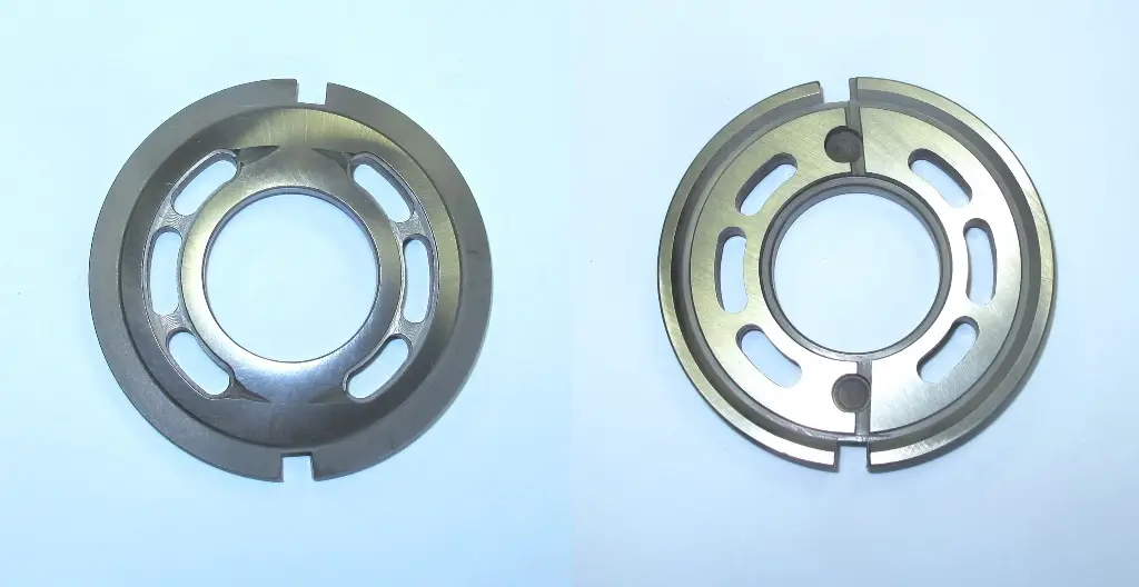 Диск из металла с центральным отверствием и каналами от поверхности контакта с блоком цилиндров до корпусных каналов нагнетания и всасывания рабочей жидкости .