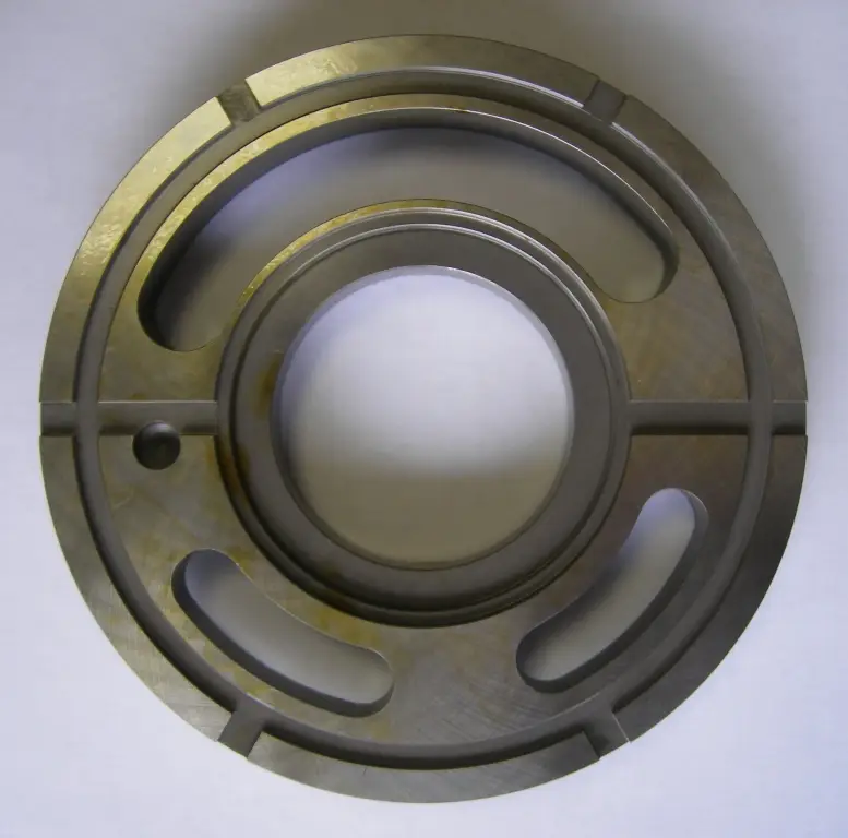 Диск из металла с центральным отверствием и каналами от поверхности контакта с блоком цилиндров до корпусных каналов нагнетания и всасывания рабочей жидкости .