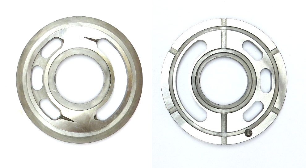 Диск из металла с центральным отверствием и каналами от поверхности контакта с блоком цилиндров до корпусных каналов нагнетания и всасывания рабочей жидкости .