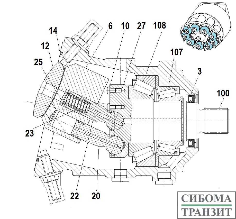 Стальной вал с шлицами для передачи крутящего момента деталям качающего узла.