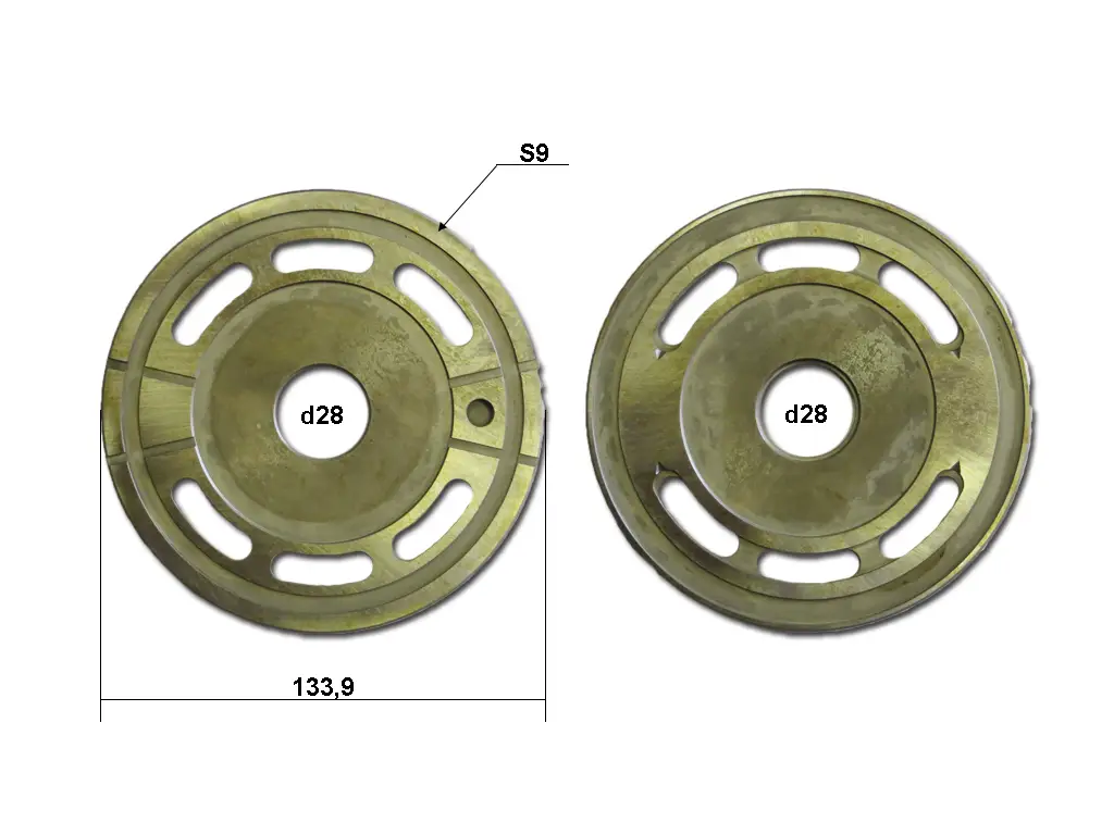 Диск из металла с центральным отверствием и каналами от поверхности контакта с блоком цилиндров до корпусных каналов нагнетания и всасывания рабочей жидкости .