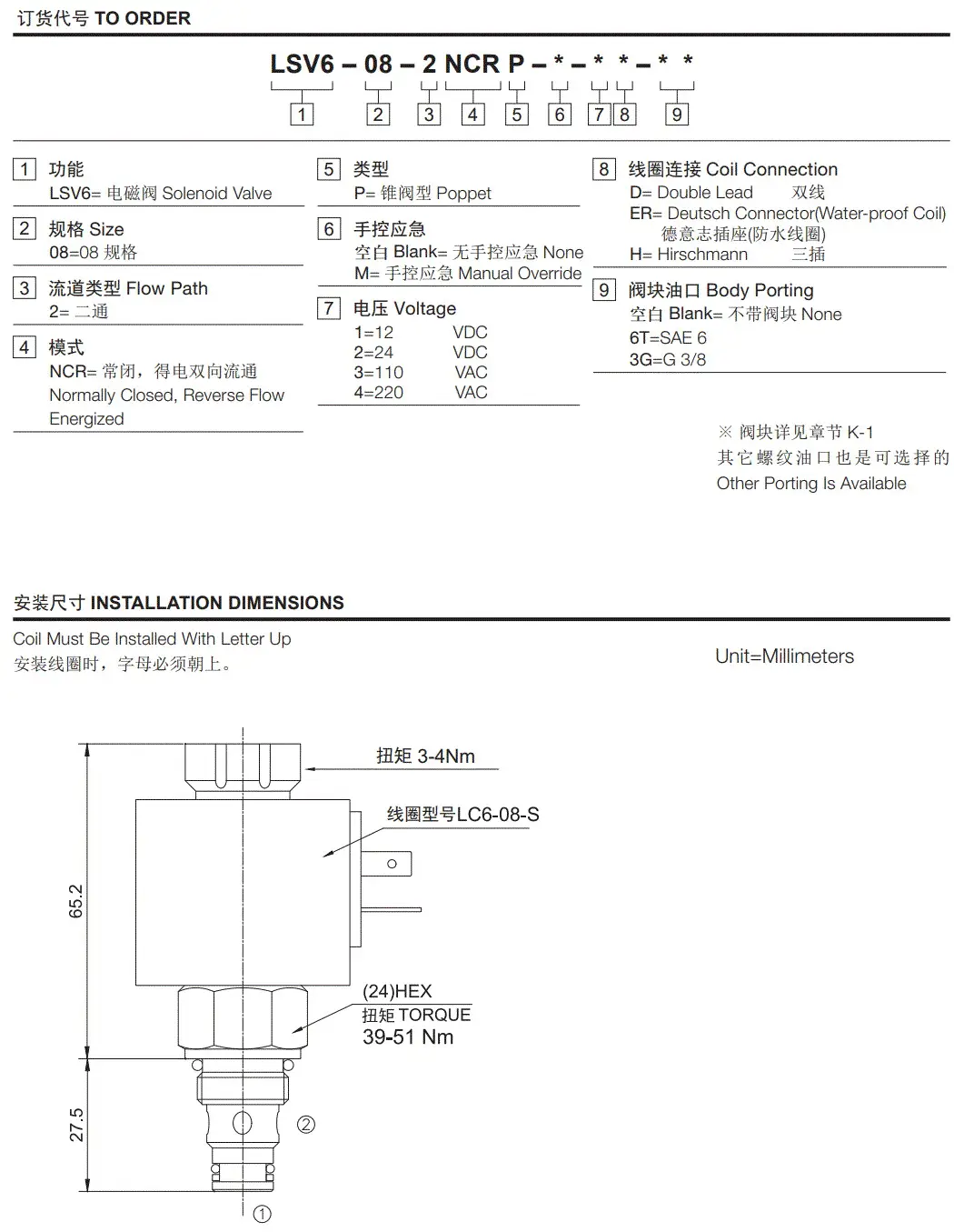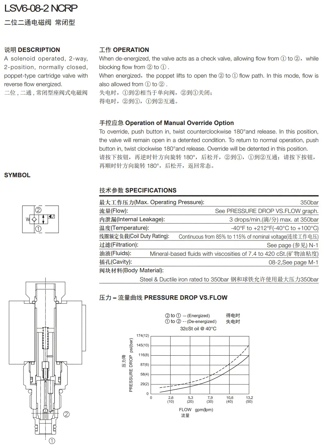 Двухлинейный двухпозиционный гидравлический клапан (гидроклапан) картриджного (ввертного) исполнения, нормально закрытый, тарельчатого типа с пилотным управлением, с дублирующим ручным управлением. Технические харакетристики: Номинальный расход - 40 л/мин, Макс. рабочее давление - 350 бар, Резьба - 3/4-16 UNF-2A, Cavity - SAE8/2 (SAE 08)