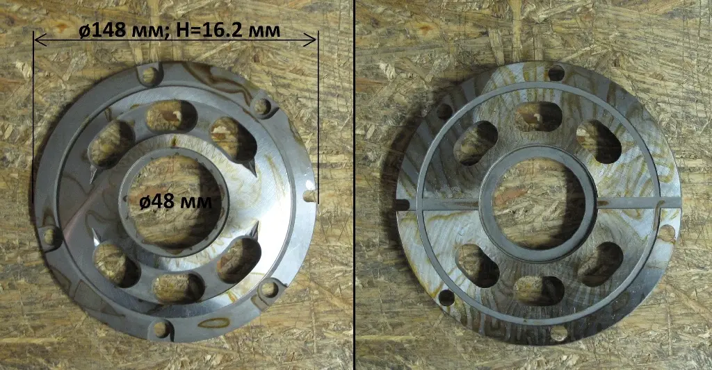 Диск из металла с центральным отверствием и каналами от поверхности контакта с блоком цилиндров до корпусных каналов нагнетания и всасывания рабочей жидкости .