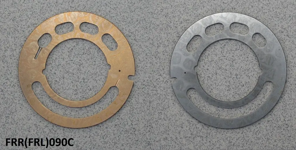 Диск из металла с центральным отверствием и каналами от поверхности контакта с блоком цилиндров до корпусных каналов нагнетания и всасывания рабочей жидкости .