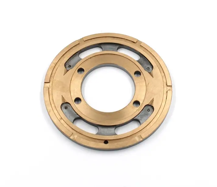 Диск из металла с центральным отверствием и каналами от поверхности контакта с блоком цилиндров до корпусных каналов нагнетания и всасывания рабочей жидкости .