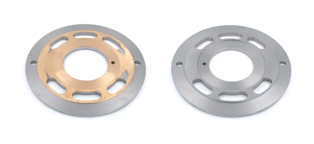 Диск из металла с центральным отверствием и каналами от поверхности контакта с блоком цилиндров до корпусных каналов нагнетания и всасывания рабочей жидкости .