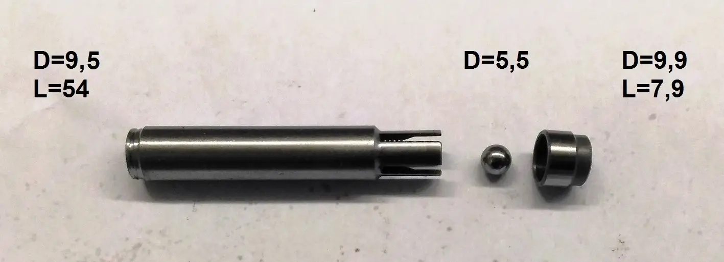 Полый стальной цилиндр с шариком внутри, который опирается на коническую поверхность меньшего диаметра чем шарик. При этом шарик закрывает движение потока жидкости в сторону конуса.