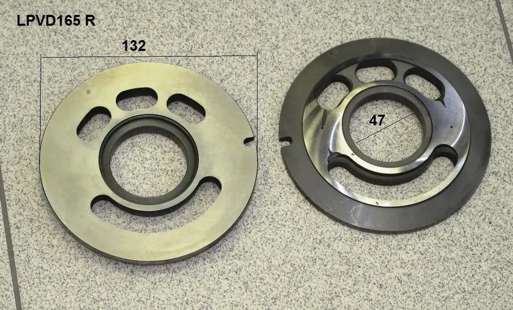 Диск из металла с центральным отверствием и каналами от поверхности контакта с блоком цилиндров до корпусных каналов нагнетания и всасывания рабочей жидкости .