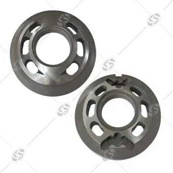 Диск из металла с центральным отверствием и каналами от поверхности контакта с блоком цилиндров до корпусных каналов нагнетания и всасывания рабочей жидкости .