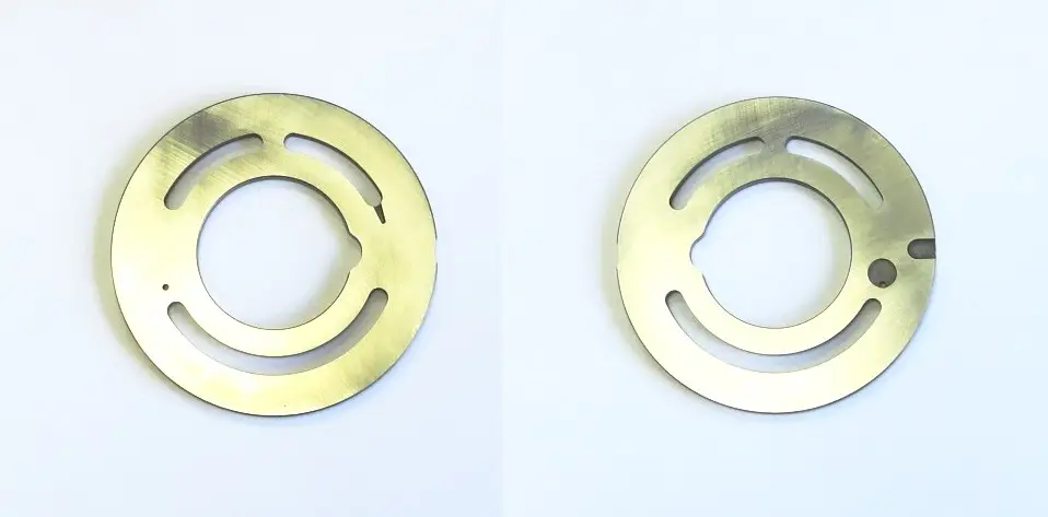 Диск из металла с центральным отверствием и каналами от поверхности контакта с блоком цилиндров до корпусных каналов нагнетания и всасывания рабочей жидкости .