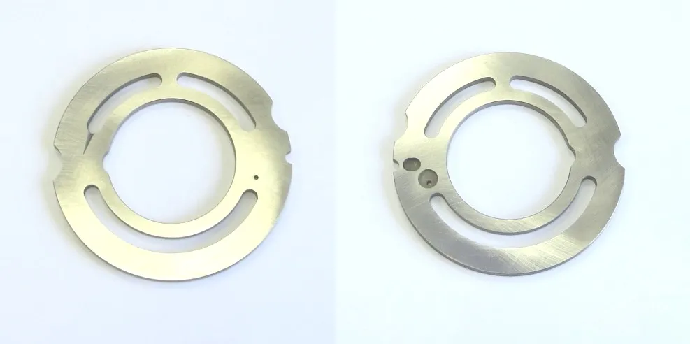 Диск из металла с центральным отверствием и каналами от поверхности контакта с блоком цилиндров до корпусных каналов нагнетания и всасывания рабочей жидкости .