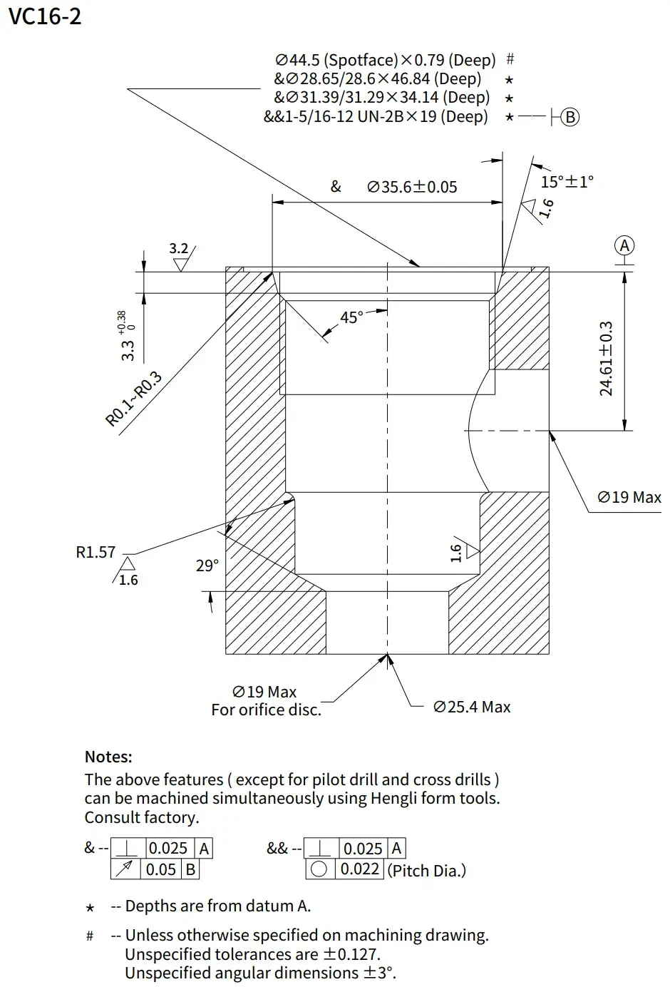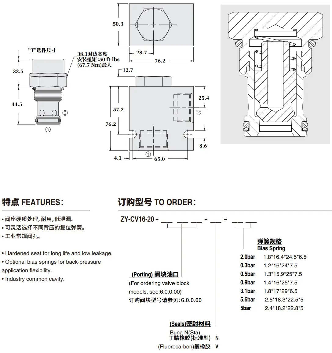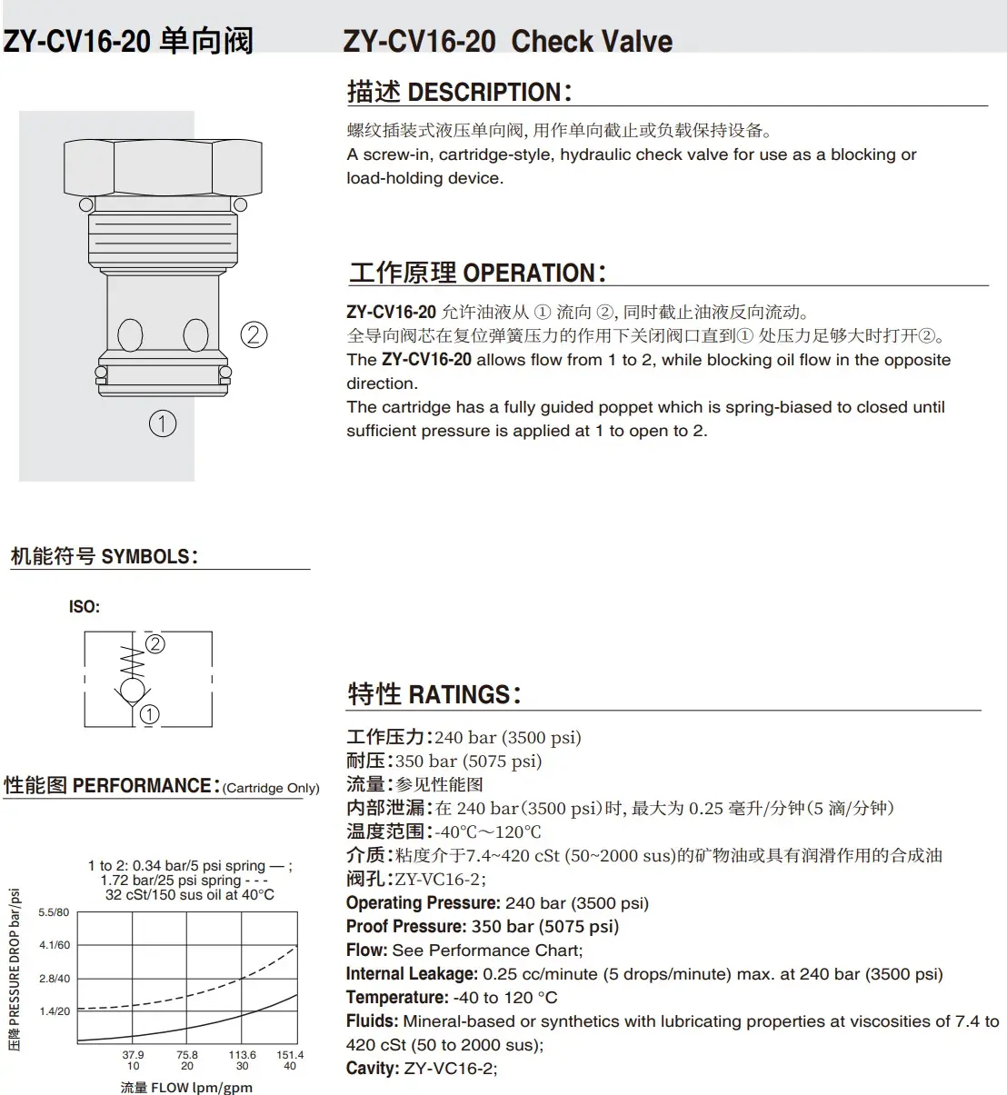 Обратный клапан торельчатого типа, картриджного (ввертного) исполнения. Технические характеристики: Корпус клапана - оцинкованная сталь, Максимальный расход - 300 л/мин, Рабочее давление - 240 бар, Давлеени открытия клапана - 3.1 бар, Температура эксплуатации -30 до +80 ºС. Cavity T-16A.