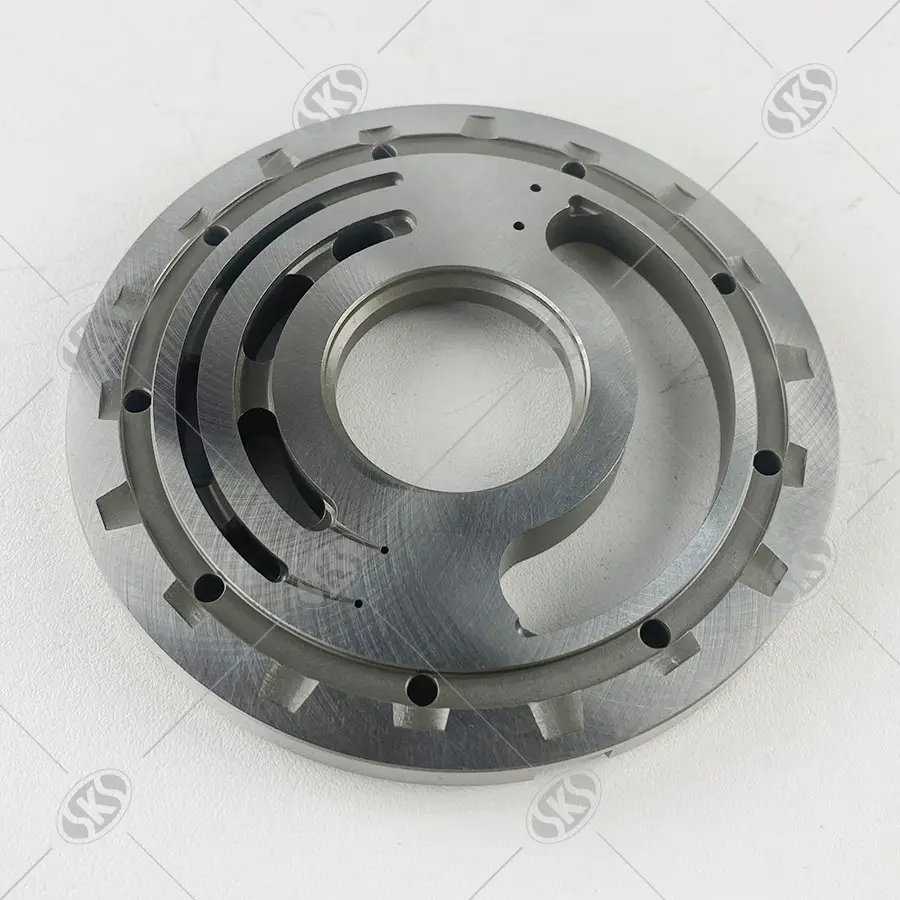 Диск из металла с центральным отверствием и каналами от поверхности контакта с блоком цилиндров до корпусных каналов нагнетания и всасывания рабочей жидкости .