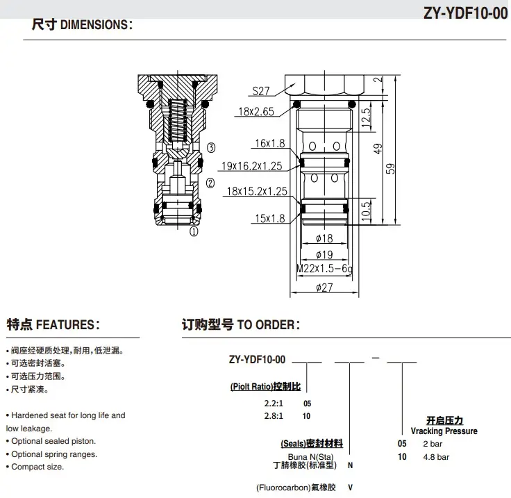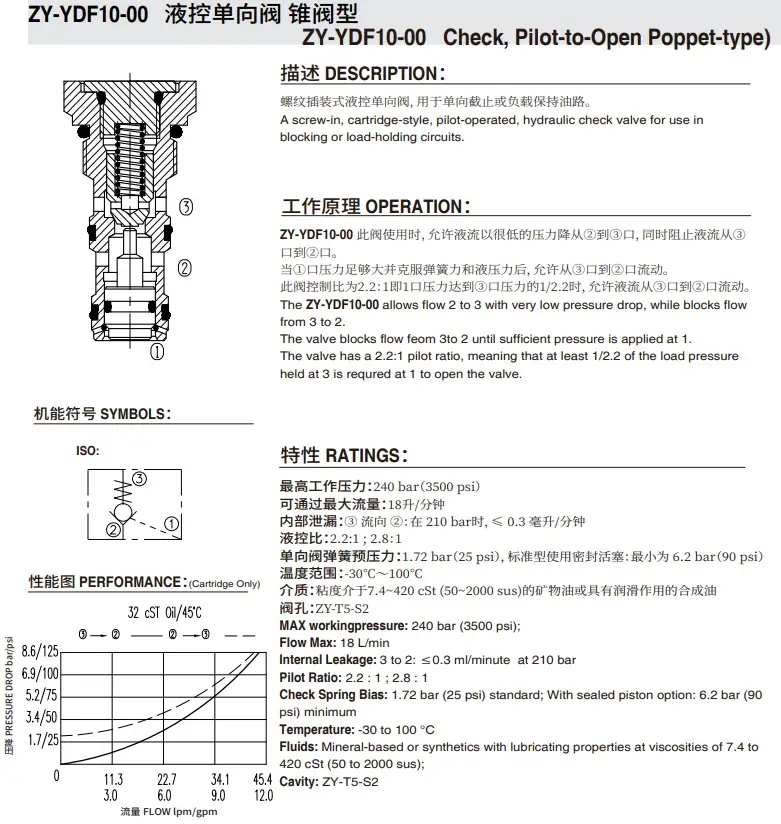 Пилотный обратный клапан, гидрозамок, ввинчиваемый, управляемый гидравлический обратный клапан для использования в блокирующих или удерживающих нагрузку контурах. Технические характеристики: Корпус клапана - оцинкованная сталь, Максимальный расход - 45 л/мин, Рабочее давление - 240 бар , Температура эксплуатации -30 до +80 ºС. Cavity T5-S2