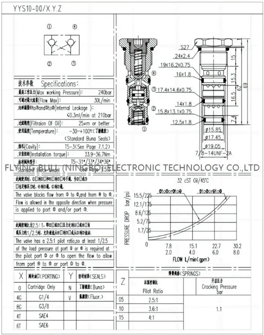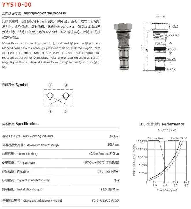 Пилотный обратный клапан, гидрозамок, ввинчиваемый, управляемый гидравлический обратный клапан для использования в блокирующих или удерживающих нагрузку контурах. Технические характеристики: Корпус клапана - оцинкованная сталь, Максимальный расход - 30 л/мин, Рабочее давление - 240 бар , Температура эксплуатации -30 до +80 ºС. Cavity T5-3/SAE10-4N
