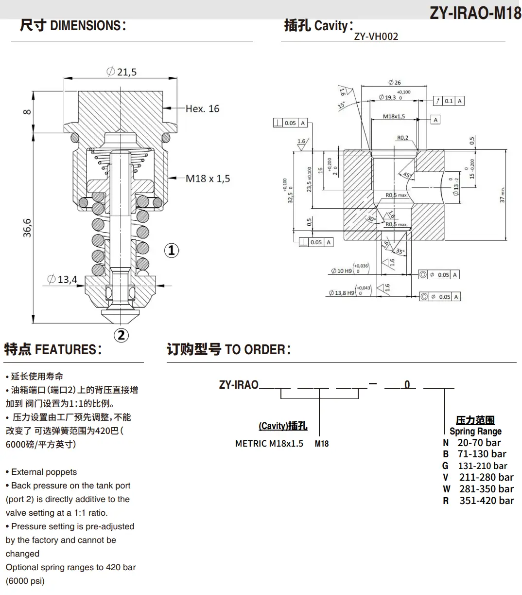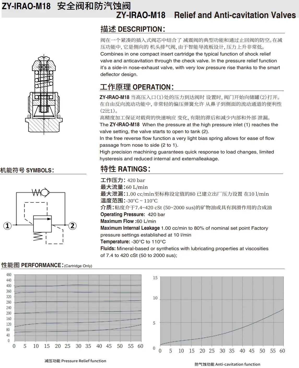 Предохранительные и противокавитационные клапаны – вставного типа. Технические характеристики: Корпус клапана - оцинкованная сталь, Максимальный расход - 60 л/мин, Рабочее давление - 450 бар, Давлеени открытия противокавитационного клапана - 0,5 бар, Температура эксплуатации -30 до +80 ºС.