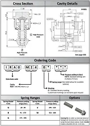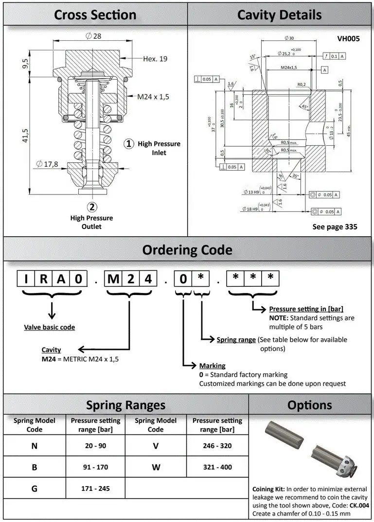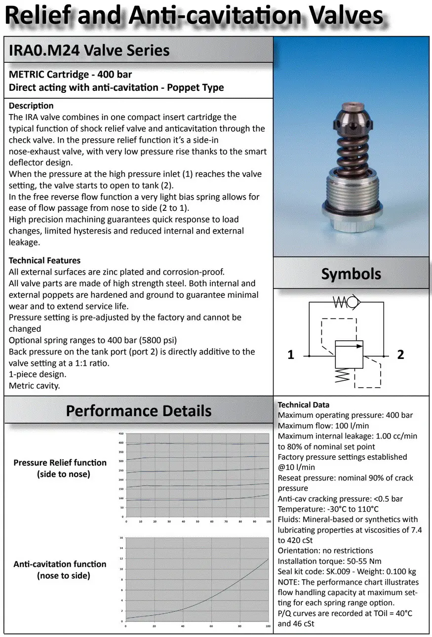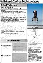Предохранительные и противокавитационные клапаны – вставного типа. Технические характеристики: Корпус клапана - оцинкованная сталь, Максимальный расход - 100 л/мин, Рабочее давление - 400 бар, Давлеени открытия противокавитационного клапана - 0,5 бар, Температура эксплуатации -30 до +80 ºС.