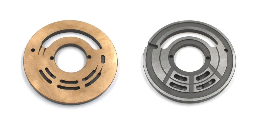 Диск из металла с центральным отверствием и каналами от поверхности контакта с блоком цилиндров до корпусных каналов нагнетания и всасывания рабочей жидкости .