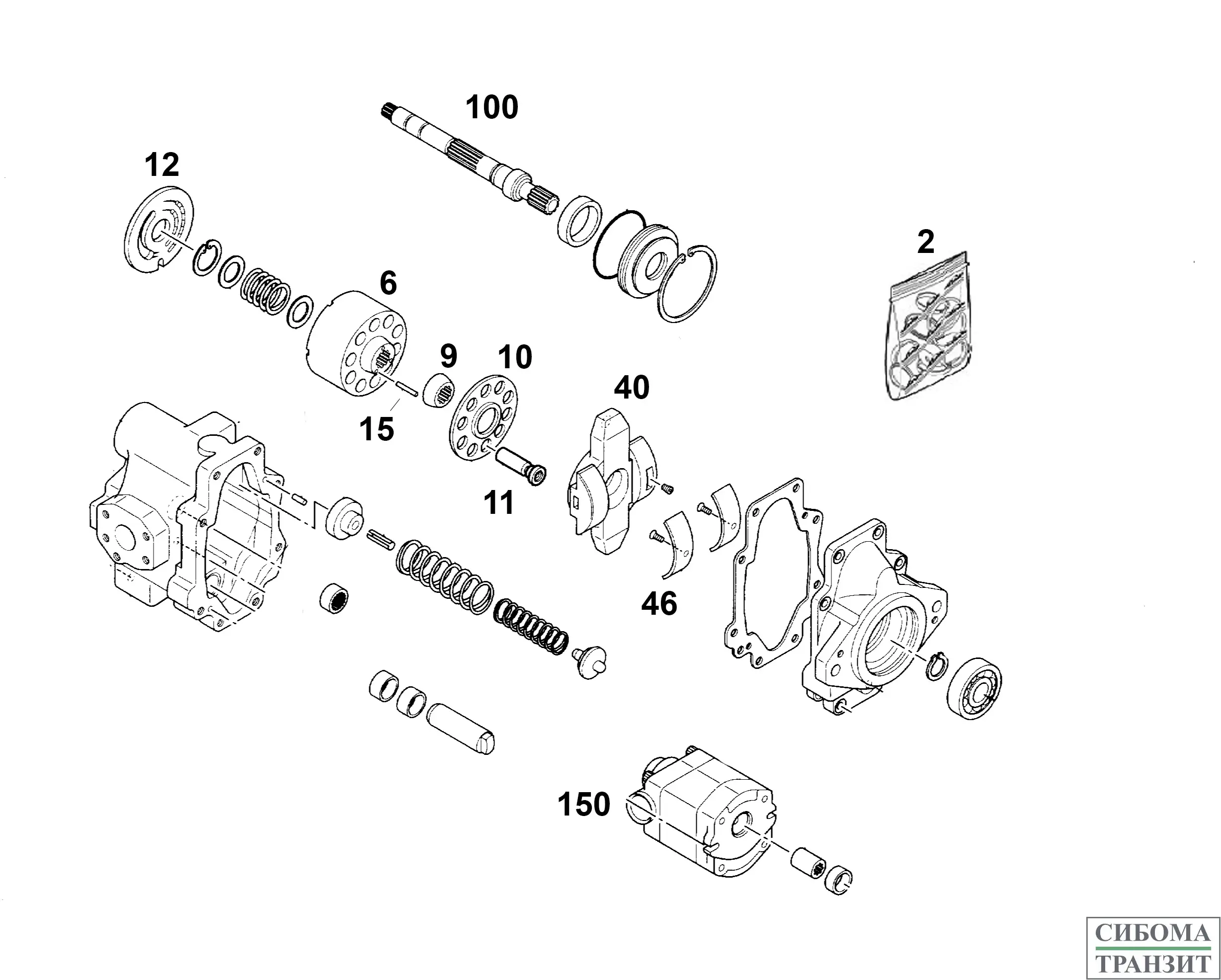 Ремкомплект вспомогательного насоса. Предназначен для создания потока рабочей жидкости для управления, подпитки и охлаждения основного насоса. Устанавливается на его корпусе и связан шлицами с его приводным валом. Состоит корпуса, удерживащего валы шестеренной пары и пластины скольжения торцев шестерён.