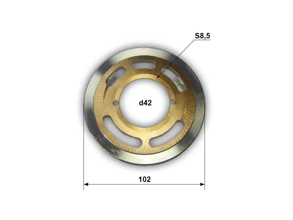 Диск из металла с центральным отверствием и каналами от поверхности контакта с блоком цилиндров до корпусных каналов нагнетания и всасывания рабочей жидкости .