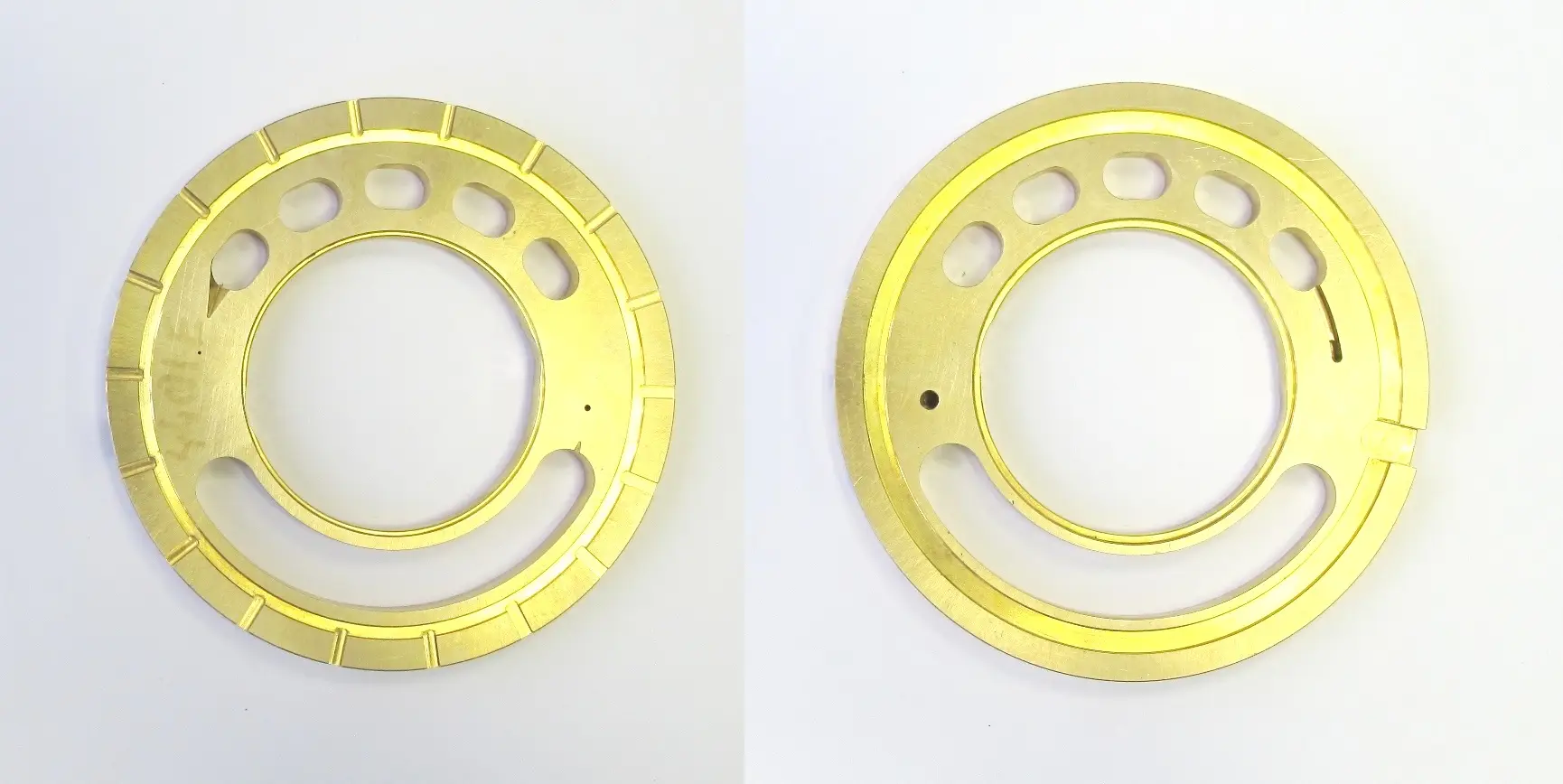 Диск из металла с центральным отверствием и каналами от поверхности контакта с блоком цилиндров до корпусных каналов нагнетания и всасывания рабочей жидкости .